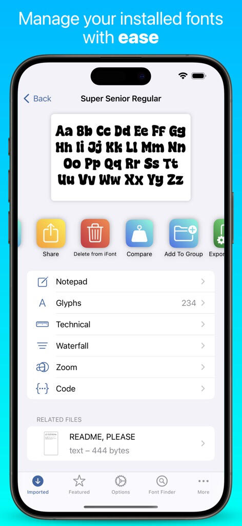 iFont includes a wide range of features which let you install, compare, and view typefaces, including individual glyphs and technical details.