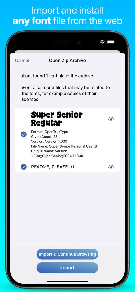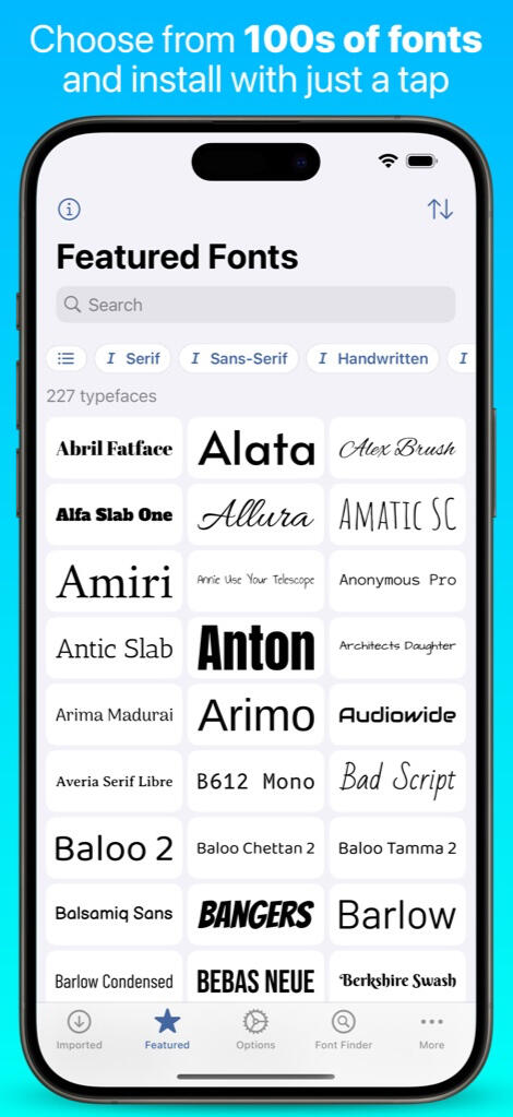 iFont lets you download and install a range of fonts from the Google Fonts library, Dafont and custom sources. Or simply add your own font files (.ttf, .ttc, .otf or a zip) and install it.